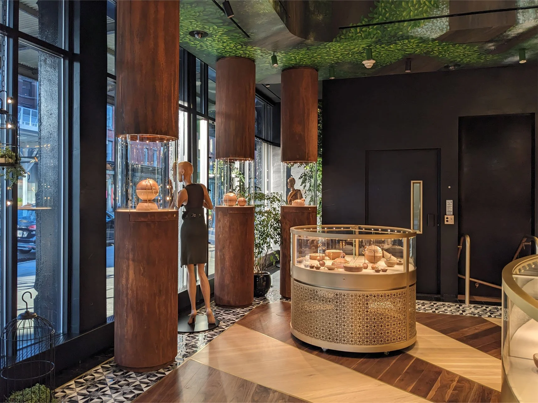 We wanted to create a strong foundation for CADAR’s pieces, allowing the craftsmanship of the jewelry to stand out. The final result is a rich, aged finish that adds depth and warmth to the space, grounding the displays while allowing the jewelry to remain the focal point.